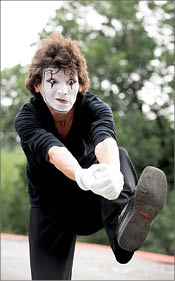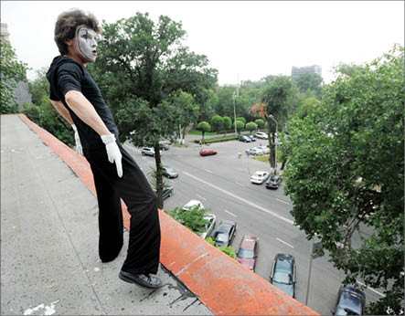 Мое знакомство с известным петербургским мастером классической пантомимы Сергеем ВАСИЛЬЕВЫМ (на снимках), больше известным под сценическим именем Sinto, произошло на крыше Алматинского дома художников, где он проводил один из своих перформансов. В южную столицу мим прибыл, чтобы познакомить алматинцев с древним языком тела, а также провести несколько мастер-классов и тренингов.