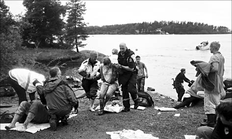 Вместо этого убийца спокойно расхаживал по небольшому острову, где собрались около 700 членов молодежного крыла Рабочей партии, многие - еще подростки. Как рассказывают очевидцы, одетый в полицейскую форму, он несколько раз подзывал к себе ребят под предлогом, что хочет помочь, а потом доставал оружие и стрелял в них. Тех, кто не умирал сразу, он приканчивал выстрелом в голову. Зная, что никого из охраны на острове нет, преступник даже расхаживал вдоль берега, стреляя в тех, кто бросился в воду в попытке уплыть с острова на большую землю.