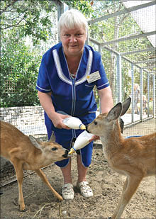 - В конкурсе победили воспитанники детского сада “Росинка”, давшие оленьим сиротам имена Ростик и Маржан, - рассказала сотрудница ботанического сада Наталья МЕРК (на снимке). - Оленята чувствуют себя как дома. Утром, когда нет посетителей, гуляют в огороженном сквере, а на кормежку молоком бегут ко мне в вольер - как к родной мамочке!
