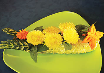 Искусство вырезания из овощей и фруктов официально называется карвинг. Елена - первый профессиональный карвингист в нашем отечестве. Конечно, любая хозяйка умеет украсить праздничный стол, соорудив мухоморчик из яйца с помидоркой или даже цветок из огуречных пластинок, но Нилова окончила самую настоящую академию карвинга в Бангкоке. Училась там у легендарного мастера, сдавала сессии, получила диплом. Вот только пока никак не может привить заморскую культуру на нашу почву. Может быть, потому что у нас во все времена лучшим украшением стола остается бешпармак, а свекла с картошкой считаются недостаточно помпезными...