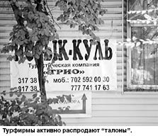Между тем турфирма “Трио” очень активно распродает талоны от ОсОО “Жардамдын Булагы”. Менеджер казахстанской туркомпании по телефону сообщила нам, что такая “страховка” стоит у них 500 тенге. То же самое нам сказали, когда мы приехали в турфирму под видом желающих отдохнуть на Иссык-Куле.