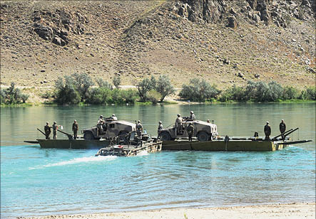 Нынешние учения прошли под знаком неожиданности. Сценарий операций военнослужащие узнавали буквально за 15 минут до их начала. Вот и мы, приехав на полигон “Илийский”, были вынуждены спешно догонять колонну военных, которые отправились на учебный центр “Берег”, где должна была пройти операция по переправке груза по воде.