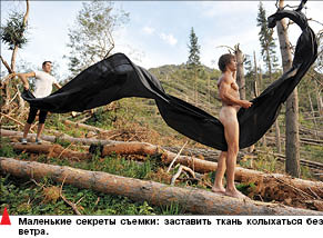 После пары пробных кадров мастер дает команду натурщику раздеваться. Затем завязывает ему глаза черной повязкой. И вот он стоит голый и растерянный среди лесного хаоса.