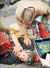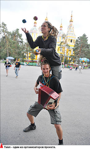 - Я на самом деле никогда не переставал странствовать, - рассказывает Тайл в перерыве между выступлениями. - Когда был помладше, путешествовал с родителями, потом - сам. Мы организовали Monkey band для того, чтобы помочь детям, особенно сиротам. Наша группа в дороге уже 16 месяцев. Вторая группа, образовавшаяся позже, сейчас путешествует на велосипедах из Германии в Россию и обратно. Мы встретимся с ними уже в Германии.