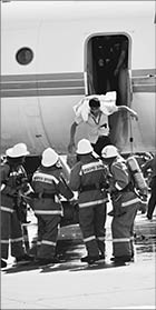 Следом за сотрудниками службы пожаротушения прибыли кареты “скорой помощи”. К этому моменту пожарные уже затушили пламя и ловили пассажиров, скатывавшихся по аварийному трапу. Всех “спасенных” врачи тут же осматривали и сортировали: “раненых” - в одну сторону, тех, кто отделался легким испугом, - в другую.