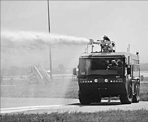 Впрочем, это понятно - в южностоличной воздушной гавани прошли противопожарные учения. К горящей крылатой машине сразу же подъехали три аэродромных автомобиля службы пожаротушения. Эти автомобили уникальны. Стоимость каждого - миллион евро.