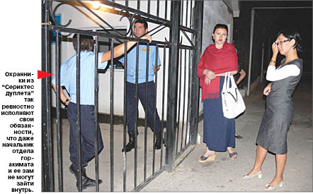 Кстати, и. о. директора центра адаптации Адиля МАДИКЕНОВА тоже найти оказалось не так-то просто. В конце рабочего дня бастыка в кабинете не было, а после 19 часов даже сотовый телефон был отключен. Пришлось привлечь к его поискам начальника отдела занятости и соцпрограмм акимата города Тараза Гаухар ОЛЖАБАЕВУ и ее заместителя. Что интересно, до появления директора двое охранников так усиленно исполняли свои обязанности, что наотрез отказались пропустить внутрь не только нас с фотокорреспондентом, но и начальницу собеса! Один из них при этом отправлял на асфальт смачные плевки.