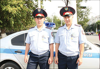 Костанайские полицейские Даулет ТЛЕУКЕНОВ и Сакен АКАБАЕВ (на снимке) получили заслуженные награды. В мае они рискнули прыгнуть с 10-метрового моста в реку Тобол, чтобы спасти самоубийцу.