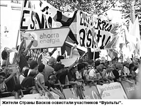 Это оптимистичное заявление генменеджер “Астаны” сделал перед 19-м этапом, который стартовал в приморском городке Нойя, а завершился на севере Испании - в Бильбао, где так не любят пришельцев. Впервые за 33 года “Вуэльта” заехала в Страну Басков. Впервые за эти годы испанские полицейские кортежи, сопровождающие пелотон, и андалузские гонщики были освистаны зрителями. На финише местная толпа вовсю размахивала транспарантами с перечеркнутым испанским флагом и улюлюкала вслед полиции. Но именно на этом этапе представитель нашей команды казахстанец Александр ДЬЯЧЕНКО ушел в отрыв. При почти 40-градусной жаре он долгое время ехал среди лидеров, но в итоге не смог противостоять более мастеровитым соперникам и финишировал только 39-м.