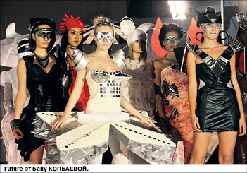 Так, Жанель МУСАХАНОВА фантазировала на тему юрского периода и динозавров, а Инесса ЖУКОВА разрабатывала футбольную тему. Были и “Духи времени”, и “Арестованные чувства”, и вечный двигатель, и геометрия... На подиуме появлялись то амазонки, то куртизанки, восточные мотивы сменялись агрессией кожаных курток и заклепок, а завораживающим нарядам противопоставлялись бутафорские конструкции.