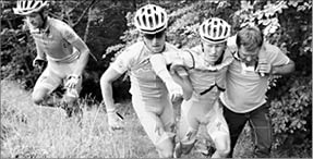 2. Лидер “Астаны” на “Тур де Франс-2011” Александр ВИНОКУРОВ (на снимке - вторй справа) во время девятого этапа, прошедшего между французскими городками Исоур и Сен-Флю, за 95 километров до финиша попал в грандиозный завал. В нем он получил травму бедра. Его срочно госпитализировали в парижскую больницу, где Саше была сделана операция. Спустя несколько дней после инцидента Вино заявил, что завершает карьеру гонщика. |