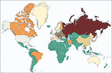 На карте вымирания страны, которым осталось меньше тысячелетия, обозначены коричневым цветом. “Светло-коричневые” будут жить в промежутке 3000-3299 годы, “молочный” принадлежит тем, кто проживет с 3300 до 3999 года. “Оранжевые” страны на земле будут существовать с 4000 до 9999 года, а “серые” - от 10000 и более. Наконец, зеленым цветом на карте отмечены “бессмертные” страны.