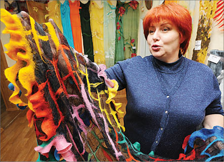 Колючий, жесткий серый войлок в руках мастера Ольги БАБКИНОЙ (на снимке) превращается в нежные шарфы и палантины. Увидеть результат этого превращения можно в галерее “Вернисаж”, где проходит первая персональная выставка “Волшебство войлока”.