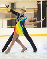 Александр даже вышел на лед на одном из городских праздников с номером “Золотой наперсток” - портной на льду снимает мерки со своей партнерши, шьет ей платье... Особенно интересно посмотреть вблизи и пощупать костюм самого кутюрье. Здесь и его герб, и перчатки-ножницы, и цилиндр-наперсток с обшитыми пупырышками... Костюм Александр делал почти два года.