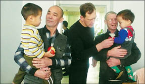 На снимке (слева направо): Марат Джумакешев с Адленом на руках, Андрей Куринный и Александр Сергалюк с Арнуром.