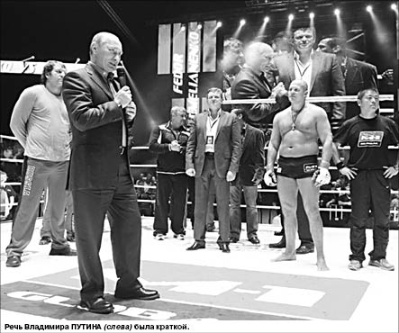 Путин вышел лично поздравить Емельяненко сразу после боя. На протяжении всей его речи с трибун слышался явно неодобрительный шум и свист. Как сказал в эфире “Эха Москвы” пресс-атташе Федерации профессионального бокса России Андрей БАЗДРЕВ, было видно, что премьер-министр был удивлен реакцией публики, однако быстро вернул самообладание. Речь Путина была короткой.