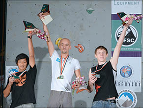 Казахстанский скалолаз Артем ДЕВЯТЕРИКОВ (на снимке - в центре) завоевал золотую медаль в дисциплине “скорость” на Международных экстремальных играх-2011 в Индии. Кроме того, он установил рекорд - 19 секунд на двух 15-метровых трассах.