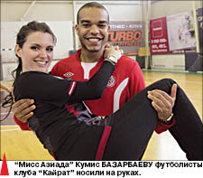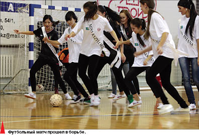Следующим испытанием для девушек стал футбольный матч с командой “Кайрат” в поддержку чемпионата Казахстана по футболу. Участницы не задумываясь сменили шпильки на кроссовки. Встреча получилась очень интересной. Девушек разделили на две команды - “белых” и “черных”. Первый гол в дружине “белых” забила “Мисс Mary Kay” Гульден ЕЛЕУКИНА, но соперники очень быстро отыгрались благодаря своему главному бомбардиру - “Мисс Азиада” Кумис БАЗАРБАЕВОЙ. Причем она дважды отличилась и стала обладателем титула “Лучший игрок”.