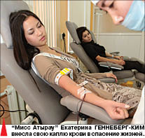 - Рада, что смогла внести свою лепту в спасение чьей-то жизни, - говорит “Мисс Атырау” Екатерина ГЕННЕБЕРГ-КИМ. - Думаю, каждый человек, если позволяет здоровье, должен обязательно принимать участие в таких акциях.