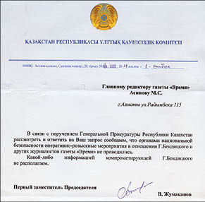У Комитета национальной безопасности вопреки заявлению экс-главы этой спецслужбы Амангельды ШАБДАРБАЕВА компромата на журналиста газеты “Время” Геннадия БЕНДИЦКОГО нет. Письмо, подтверждающее это, мы получили вчера на официальном бланке КНБ (на снимке) за подписью его первого зам­преда Владимира ЖУМАКАНОВА.