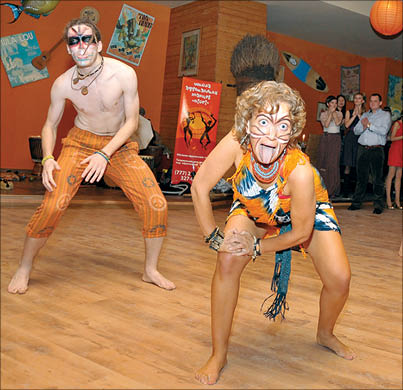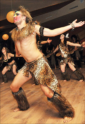 ...Полдень в африканской деревне. Возвращаются с охоты мужчины в боевой раскраске. Радостно встречают добытчиков девушки, предвкушая обновки из шкур и вкусный ужин. Все племя весело скачет под звуки барабанов. Так вкратце можно пересказать сюжет выступления, которым открыла вечер школа африканских танцев “Ниори”. В зале стало жарко! Народ начал расписывать лица и двигать бедрами под звуки бубнов и диджериду. Начались игры с бананами и состязания: чье “племя” лучше изобразит обезьяну на пальме или жирафа, объедающего молодые листья акации. Чем же так привлекательна оказалась африканская тематика?