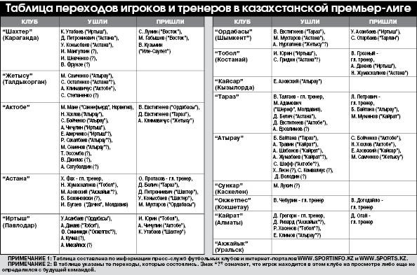 В клубе, который в прошлом сезоне не достиг никаких успехов ни в национальном первенстве, ни в розыгрыше Кубка РК, как и в сезоне 2011 года, наплыв дорогостоящих футболистов. Среди них отметим самого дорогого казахстанского игрока Таната НУСЕРБАЕВА (800 000 евро) и лучшего футболиста республики прошлого года Жамбыла КУКЕЕВА (275 000). Покинули столичный коллектив в это межсезонье не менее ценные футболисты Нурбол ЖУМАСКАЛИЕВ (325 000) и Бобби БОЖИНОВСКИ из Македонии (300 000). Их потерю генеральный спонсор команды - “Казахстан темир жолы” - намерен компенсировать игроками казахстанской сборной Сергеем ОСТАПЕНКО (350 000) и его тезкой ГРИДИНЫМ (150 000). Подписание соглашений с ними состоится со дня на день.