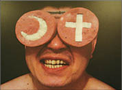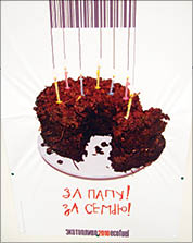 Другая социальная ремарка - плакат с тортом из навоза - переносит зрителей во времена двухлетней давности, когда в соседней республике отключили свет и газ, а президент посоветовал топить домашние печи кизяком. А вот самая скандальная вещь прошлого года: три юрты, загнанные, как бараны, под крыши цвета российского и американского флагов. Автор просил передать: он любит родину - просто щемит она ему сердце. Молодежь города Оша демонстративно содрала этот плакат, развешанный на щитах, и прилюдно сожгла. Раздражал общественность и постер с неприличными жестами, изображающими год 2011-й.