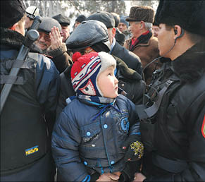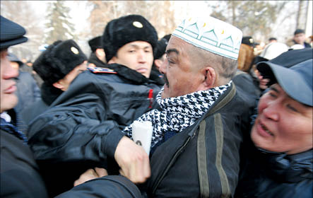 Участники митинга часа полтора пытаются самоорганизоваться. Тех, у кого это получается, СОБР с почестями уносит на руках в “газели” и “пазики”. Первым этой “чести” удостаивается член ОСДП Кайрат ЕРДЕБАЕВ (на верхнем снимке): он слишком громко кричал о произволе в стране. “Обезглавленные” протестующие пытаются разделиться. Когда у них это получается, полицейские перегруппировывают силы так, что каждая группа митингующих оказывается в плотном кольце. На улице зябко. Кофейню у гостиницы “Казахстан”, из которой пришедшие журналисты и оппозиционеры таскали кофе и чай в пластиковых стаканчиках, срочно закрывают. Через полчаса из нее покажется румяный майор. Сразу понятно - сидя в кофейне, предотвращал массовые беспорядки.