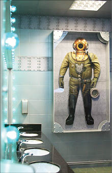 Правда, есть одно “но” у этого общественного места на карте столицы - это уборная только для мужчин. Здесь все атрибуты субмарины: стоя у писсуаров, через иллюминаторы можно созерцать косяки рыб. Потолок и окна выполнены в виде шлюзовых камер в 3D, батареи прикрыты огромными гребными винтами. Каждая кабинка - батискаф, где, сидя на унитазе, можно наслаждаться соседством с акулой, аквалангистом или коралловым рифом. А еще в уборной раздаются звуки подводного мира, характерный скрип обшивки лодки, выкрики экипажа, а из всех углов выпускают пар. Все это, по словам дизайнера, только облегчит функциональную задачу туалета: в такой атмосфере не страшен никакой запор.