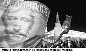 Жириновский и Миронов уже признали итоги выборов и поздравили Путина с победой. Премьер-министр также пообщался по телефону с Прохоровым, подчеркнув, что бизнесмен-самовыдвиженец добился “достойных результатов”. “Мы здесь говорили с журналистами до нашего разговора о возможности создания еще одной правой партии. Успехов вам”, - сказал Путин.