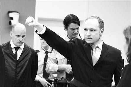 Как только в зале суда с Андерса Брейвика сняли наручники, он тут же приложил правую руку к груди и вскинул её в нацистском приветствии