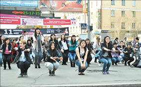 Около сотни молодых людей синхронно приседали, прыгали, делали самые разные упражнения на центральном перекрестке города. От удивления замирали не только прохожие, но и автомобилисты, создавшие нешуточную пробку.