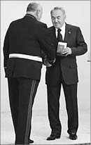 Вчера в Акорде был настоящий экзамен для поседевших военных. И хотя от них требовалось пройти четким строевым шагом до Нурсултана НАЗАРБАЕВА, чтобы получить из его рук награду, видно было, какой ценой дается им эта “генеральная линия”.