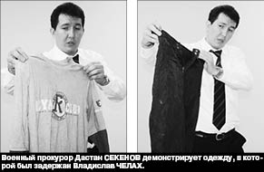 После небольшого брифинга военпрокурор представил журналистам вещи, изъятые у В.Челаха в момент его задержания: пистолет, 12 тысяч тенге, а также гражданскую одежду: куртку, спортивные штаны, обувь (в это и был одет задержанный) командира погранпоста “Аркан-Керген” Алтынбека КЕРЕЕВА. Кроме того, по словам Дастана Секенова, у В.Челаха были обнаружены восемь мобильных телефонов и ноутбук, в кармане одежды - обручальное кольцо погибшего контрактника Талгата САРСЕМБАЕВА, которое позже опознала его супруга.