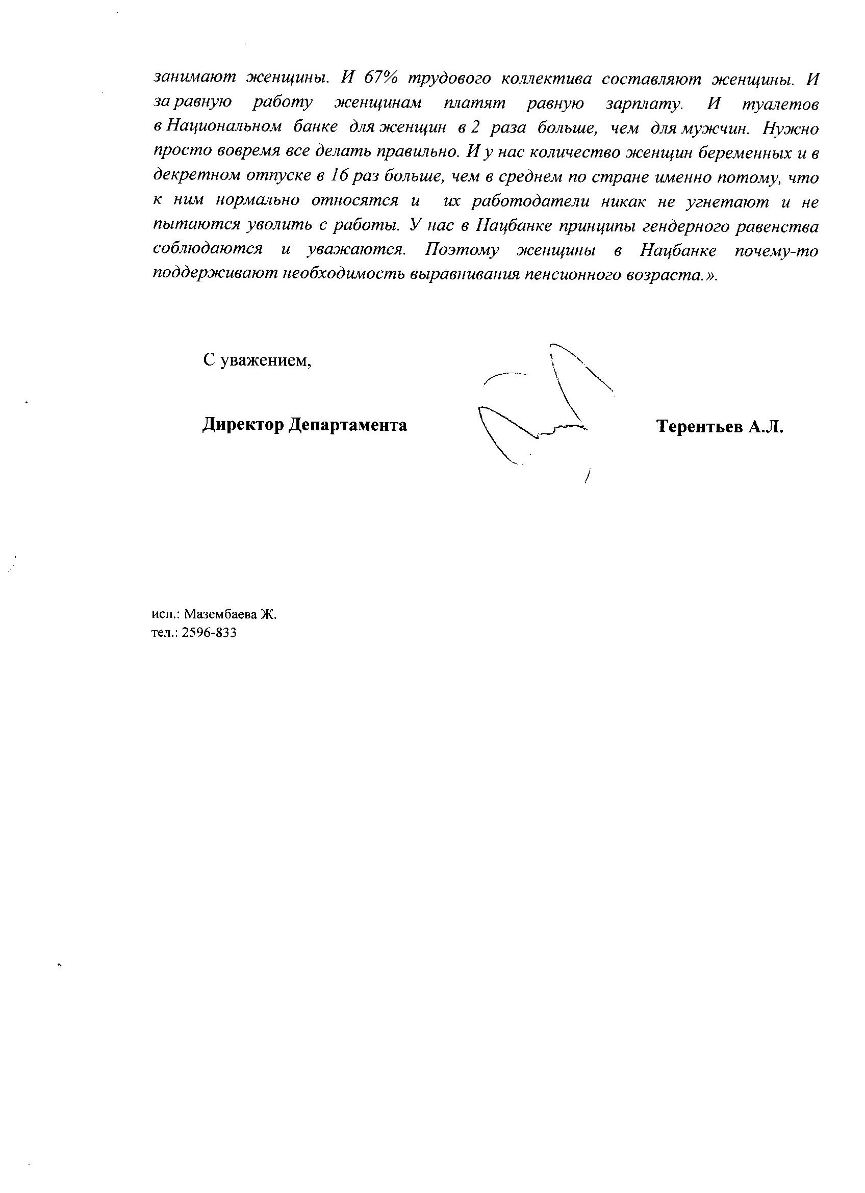 12 июня в нашей газете была опубликована статья “Туалет - лучше для реформы нет?”, в которой рассказывалось, почему председатель Национального банка РК Григорий МАРЧЕНКО выступает за увеличение пенсионного возраста женщин с 58 до 63 лет, а также приводились слова главного банкира страны о том, как хорошо работается женщинам в его ведомстве.