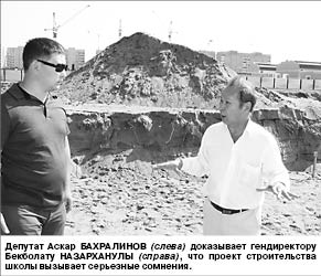 - Вообще же мы считаем, что там надо не завозить грунт, а наоборот, снимать его, - подчеркнул Абдыкалыков. - Мы просили генподрядчика: не строй выше, чем построены наши городские объекты. Он не слушает. Говорили: с таким количеством людей ты объект вовремя не закончишь (согласно стройпаспорту, школу должны были сдать в июле этого года. - О.В.). Советовали увеличить число строителей. Не реагировал. Давать указания ТОО “Бек жолы НС” акимат области не имеет права, потому что заказчиком строительства является акционерное общество “Назарбаев - интеллектуальные школы”.
