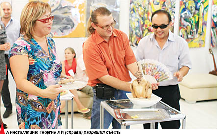 Георгий ЛИ глубоко ушел в исследование перехода материи из одушевленной формы в неодушевленную, чему пример - его картина “Кактус. Мужская депрессия”. Его же буйной кисти принадлежит “Корейская свадьба” и отдельно исполненная инсталляция из курицы с головой петуха, украшенная новогодней мишурой. Благо к этому моменту все присутствующие уже тяпнули, и потому небольшое объяснение от автора прошло на ура.