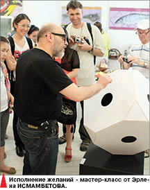 Поскольку концептуально-юморное искусство не продается, еще один участник выставки, Эрлен ИСМАМБЕТОВ, нашел выход. Он соорудил “Механический исполнитель желаний”. Все присутствующие могли кидать монетки в отверстие странной фигуры и загадывать сокровенное. Сбычу мечт автор гарантировал настолько искренне, что никого не смутило отсутствие фискальных чеков... Сам автор с подкупающей честностью озвучил собственную мечту: