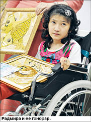 - Когда мы пошли в первый класс, Радмиру признавали необучаемой, - рассказывает Гульбану, мама Радмиры, - но мы занимались с учительницей, и она первая заметила, что у девочки фотографическая память, посоветовала нам заняться рисованием. Я зацепилась за это, и действительно уже в первом классе наш рисунок вошел в календарь. Потом Радмира попала в детский реабилитационный центр “Арди”, и оказалось, что ей все интересно - шитье, вышивка, рисунок. Она очень усидчивая, несмотря на заболевание. У Радмиры появляется азарт - закончила одну картину и уже есть замысел следующей. А главное - теперь у нас появилось слово “хочу”. Она просит всюду ее возить, ей все интересно видеть.