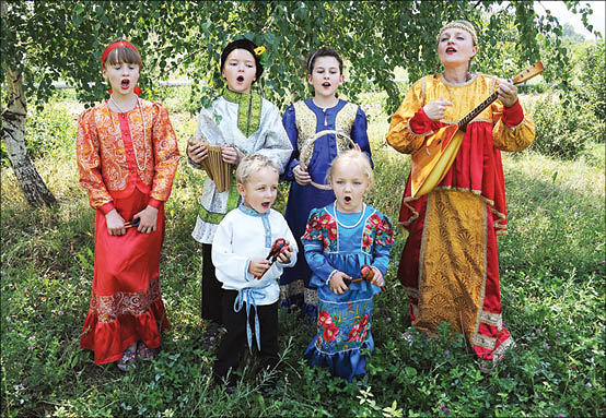У берез распевается детский ансамбль “Семиряночка”, ребята разодеты в красочные костюмы, с балалайками, ложками и другими музыкальными инструментами.