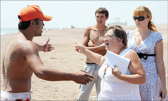 К нам подходят два парня, спрашивают: “Кто тут главный?”. Передают трубку. Истеричный женский голос сообщает, что мы вторглись на частную территорию и не имеем права здесь снимать. Вскоре к нам подходит женщина. Видимо, та самая, что зачитывала наши права в трубку. Представляется “рабочей пляжа”. И начинает ругаться с жителями: