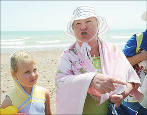 Мы прошли на городской пляж. Пустой участок обнесен забором. Шлагбаум. Будка с надписью “Частная территория базы отдыха “Сауле” и прейскурант на заборе. Цены за проход от 300 до 500 тенге, за машину - до 1000. Лежаки, зонтики и прочие прелести цивилизации за отдельную плату. То есть просто за вход на территорию, считающуюся общественной, здесь берут немалые деньги. Правда, есть запись о том, что местных пенсионеров и детей до 12 лет пускают бесплатно. Только вот с собой постоянно надо приносить подтверждающие социальный статус документы.