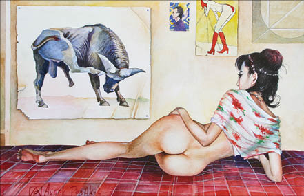 Он умеет вывернуть даже самый невинный сюжет. Например, классические амуры - толстые, розовые младенцы с крылышками. Но в голове художника уже созрел план картины “Охота на амуров” - голая грозная всадница на мощном животном, а к луке седла приторочена пара пухлых “пернатых”, один традиционного вида, другой темнокожий и с крыльями попугая. Так Розаков хочет отомстить Амуру за то, что тот никак не найдет ему подходящей спутницы жизни.