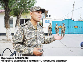 - Раздался выстрел, и стало ясно, что намерения у нарушителей серьезные, - к диалогу подключается дежурный по части старший лейтенант Нурдаулет ЕСКАРАЕВ. - На мое требование прекратить провокацию они не среагировали: вновь прогремели выстрелы, и в сторону военных снова посыпался град камней. В этой ситуации я принял решение применить табельное оружие - вынул из кобуры пистолет Макарова и выстрелил в воздух. Но только после седьмого предупредительного выстрела нападавшие заскочили в джип и дали по газам.