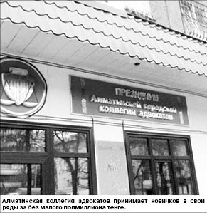 - В Алматинской областной коллегии ставка вступительного взноса составляет 250 тысяч тенге, - говорит адвокат Рашит НИСАНБЕКОВ. - Эту плату коллегии взимают уже, наверное, лет десять, не меньше. И если раньше эти поборы были незаконными, то теперь они узаконены поправками в законодательство об адвокатуре, принятыми 28 декабря прошлого года. Ставки каждая коллегия устанавливает самостоятельно.
