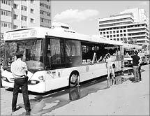 Пресс-служба ДВД Астаны сообщила, что авария произошла по вине двадцатилетнего водителя автокрана QY25k5 А. КАНХОЖАЕВА. Управляя автокраном, при повороте налево в сторону улицы Кумисбекова он допустил столкновение с пассажирским автобусом Skania № 36, в салоне которого находились 30 человек. Водитель автобуса 37-летний М. КУНТУАРОВ не пострадал. Обвиняемый в ДТП Канхожаев находится сейчас в изоляторе временного содержания столичного ДВД. Возбуждено уголовное дело по статье 296 ч. 3 УК. Ведется расследование.