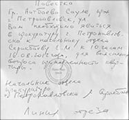 В рукописном тексте на обычном листке бумаги не были указаны ни адрес Сауле Айтпаевой, ни номер кабинета, куда ей следует прийти, даже фамилия ее была написана неправильно. Тем не менее из послания следовало, что ей “необходимо явиться в прокуратуру г. Петропавловска к начальнику отдела Серикбаеву С. М. к 10 часам 16.8.2012 г. для выяснения вопроса принадлежности квартиры”.