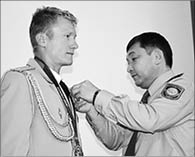 У олимпийского чемпиона Александра ВИНОКУРОВА в минувшую субботу на две медали стало больше. Начальник ДВД Северо-Казахстанской области Мурат УРУМХАНОВ лично прикрепил на полицейский мундир знаменитого велогонщика медали “20 лет казахстанской полиции” и “За выслугу лет в ОВД” (на снимке).