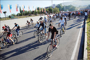 Праздничный веломарш собрал более трех тысяч участников. Еще бы - всем хотелось проехать в одной команде с олимпийскими чемпионами Александром ВИНОКУРОВЫМ и Ильей ИЛЬИНЫМ.