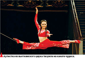 ...Раздались праздничные фанфары, и первыми на арену вышли воздушные гимнасты вьетнамского цирка. Описать то, что показывали они под куполом, словами невозможно - это надо видеть. Причем работали ребята без страховки. И каждый раз, когда качели поднимались вверх, зрители просто замирали от восторга. Девушка на канате, тоже без страховки, выделывала что-то невообразимое: она садилась на шпагат, доставала зубами платок и даже танцевала. За свою смелость и бесстрашие цирк Хо Ши Мин был удостоен золотой статуэтки фестиваля.